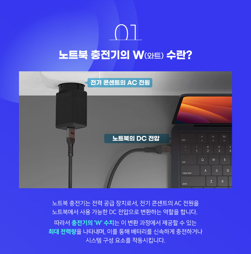 노트북 충전기는 전력 공급 장치로서, 전기 콘센트의 AC 전원을